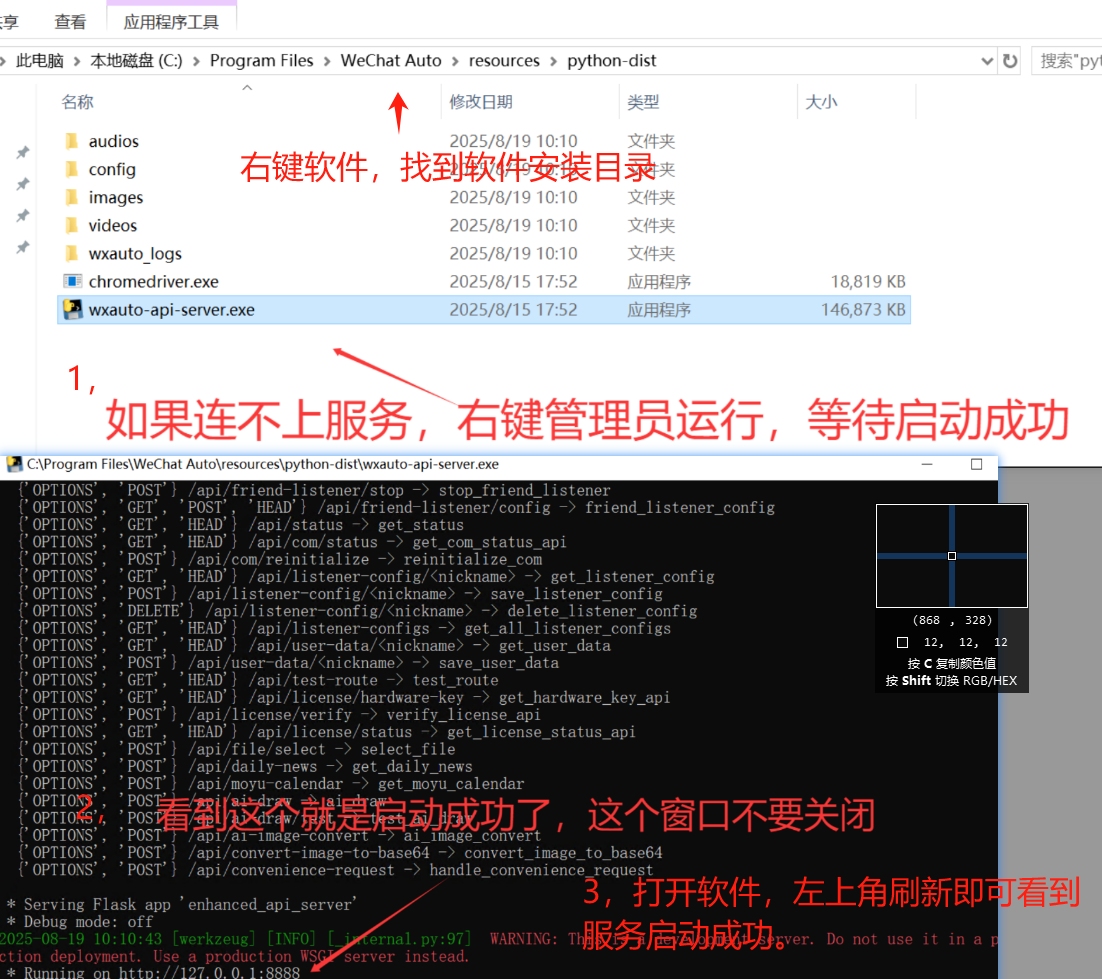 5.3.15:转发配置新增所有信息转发,其他已知问题优化。5.3.12:定时任务,窗口异常关闭等问题修复。5.3.6:问答配置支持导入导出配置。新增邀请奖励配置。5.3.4:定时任务新增结合便民配置。修复便民配置发送视频问题。修复开启梯子连接失败问题。5.3.0:新增转发配置。新增娱乐@功能。5.2.0:新增自定义消息处理配置。修复接口纯文本问题。5.0.0:新增Coze AI。新增定时请求Api。新增自动添加群聊好友。修复ai图片风格转换问题。4.0.0:新增文生图功能。新增图片风格转换功能。新增文件下载功能。3.5.2:修复添加好友相关问题.其他已问题修复,增强系统稳定性。3.5.0:新增打字机模式。新增重复消息过滤。新增延时处理消息。修复添加好友/定时配置相关问题。3.4.0:新增自动同意好友申请。🎉 感谢您的支持!